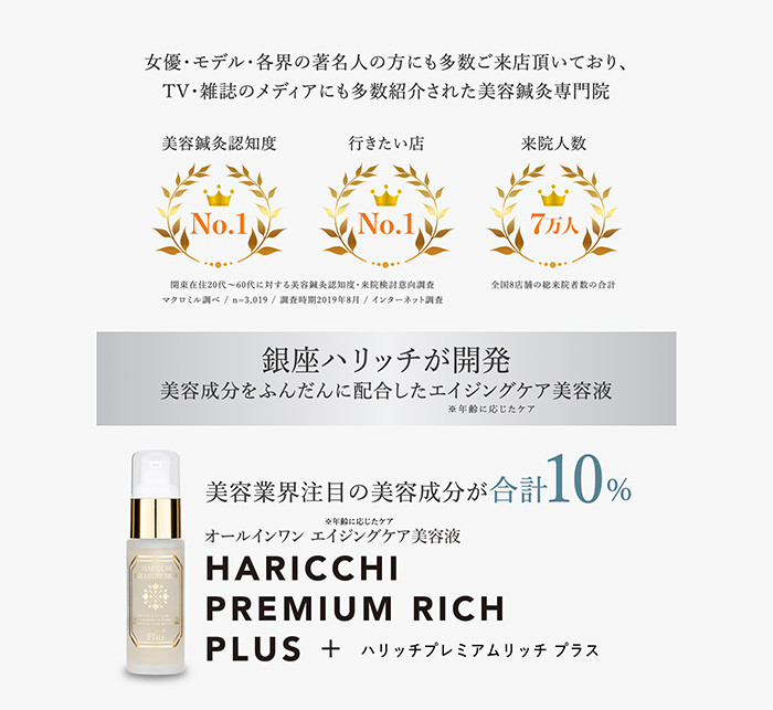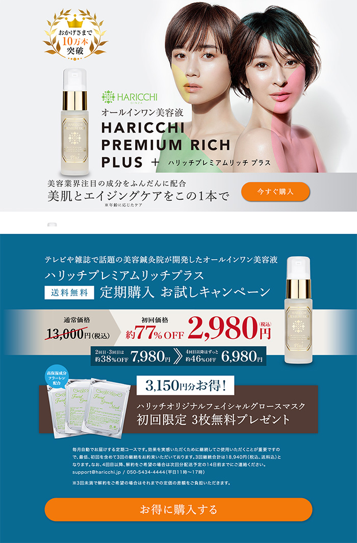 Works ─ detail 銀座ハリッチ/ランディングページ 美容鍼灸院チェーン大手の銀座ハリッチ様のプロダクトランディングページ。高級商材に合わせたデザインと販売促進に向けたコンテンツを融合しました。当社にて構成編集、ライティング、デザイン、コーディングまで全てを制作担当。 View All Works