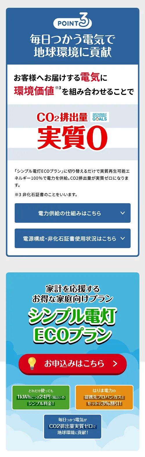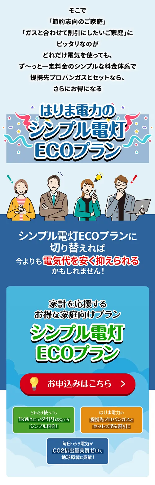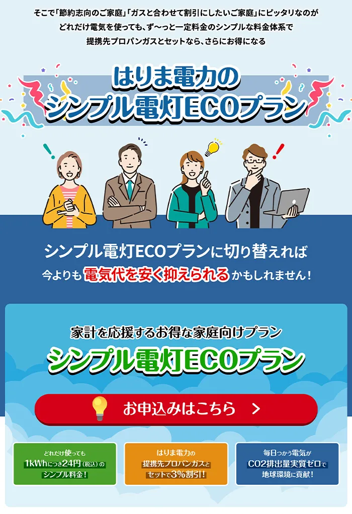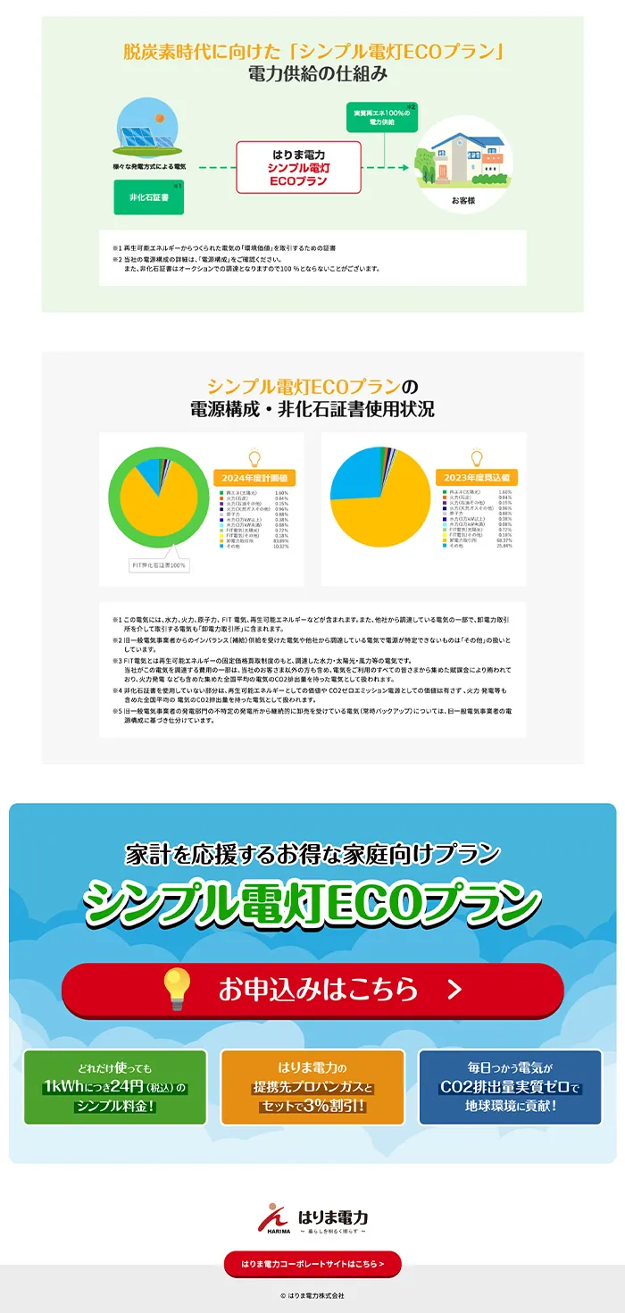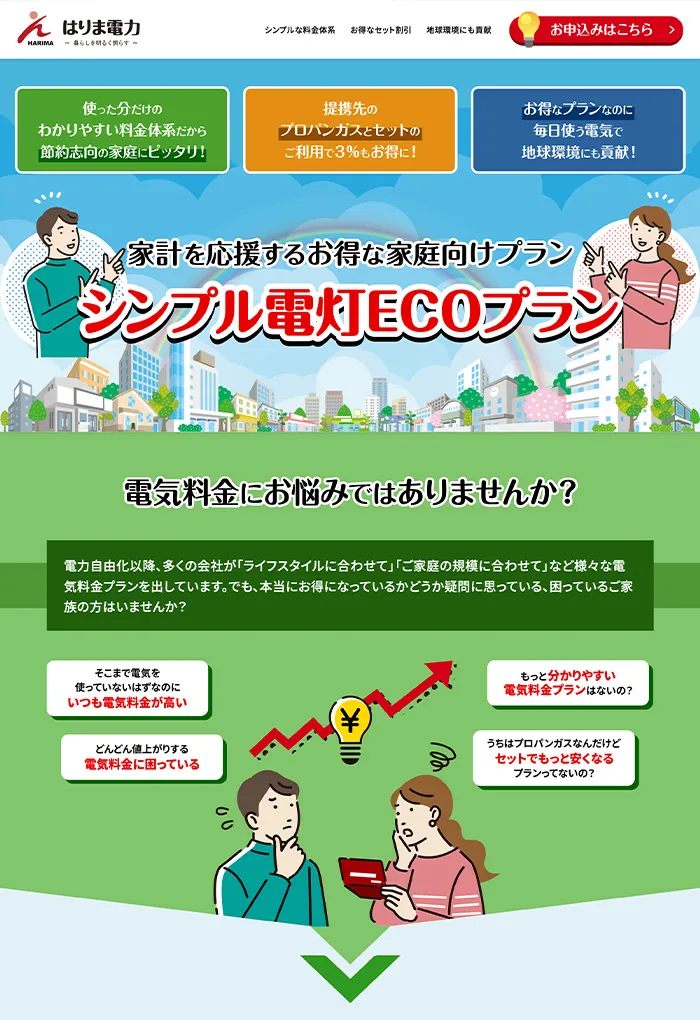 Works ─ detail はりま電力株式会社 シンプル電灯ECOプラン/ランディングページ 兵庫を地盤とする新電力サービス会社、はりま電力の「シンプル電灯ECOプラン」ランディングページ。構成企画からライティング、デザイン、コーディングまで当社で担当しました。 View All Works