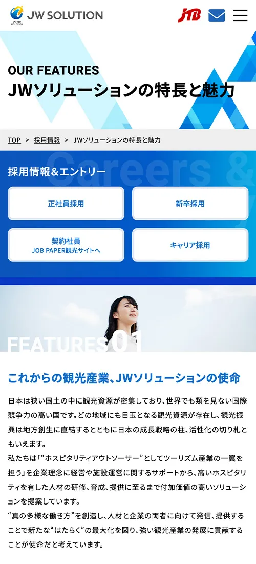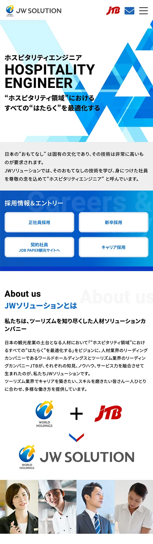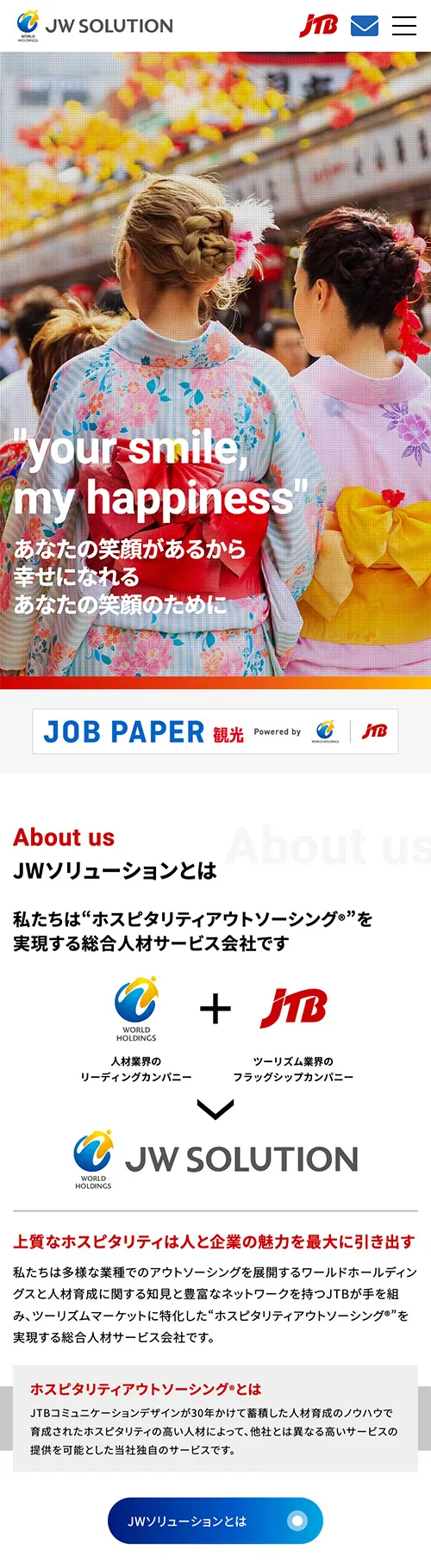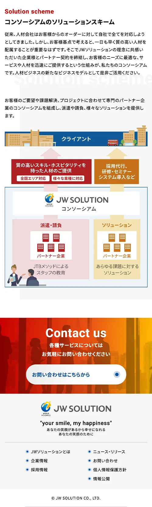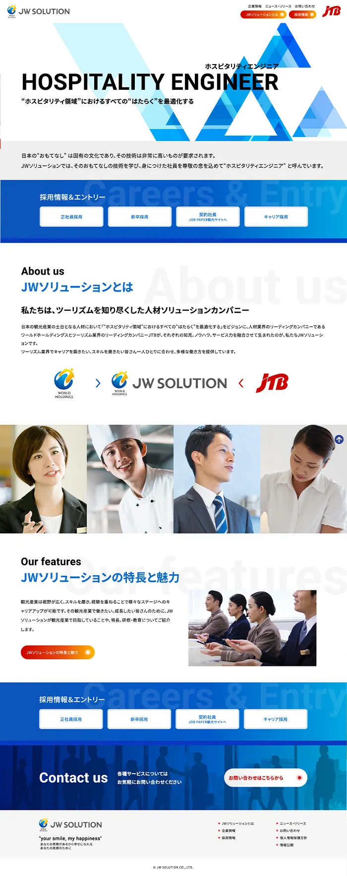 ツーリズム業界最大手のJTBと人材業界大手のワールドが出資した観光業界専門の人材企業JWソリューションのコーポレートサイト。会社設立に合わせた新規制作だったこともあり企業ブランドやコンセプトメイキングからコミットして制作。構成企画からライティング、デザイン、コーディング、実装まで全て担当。