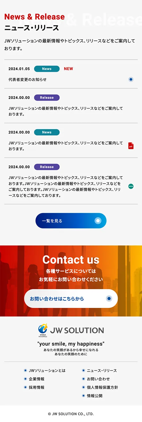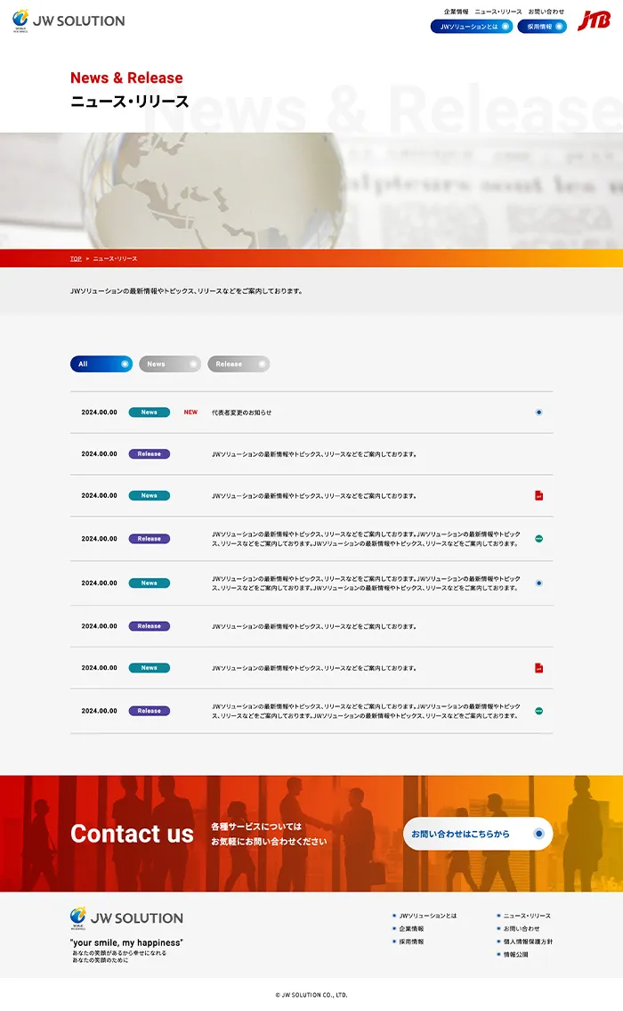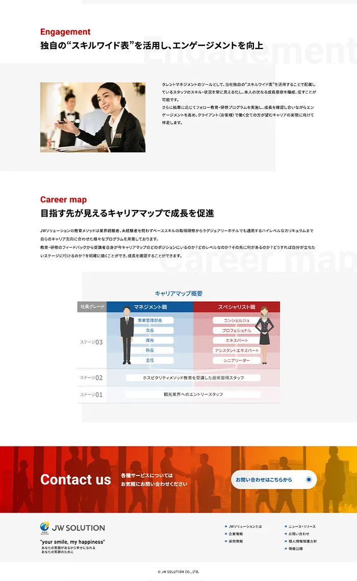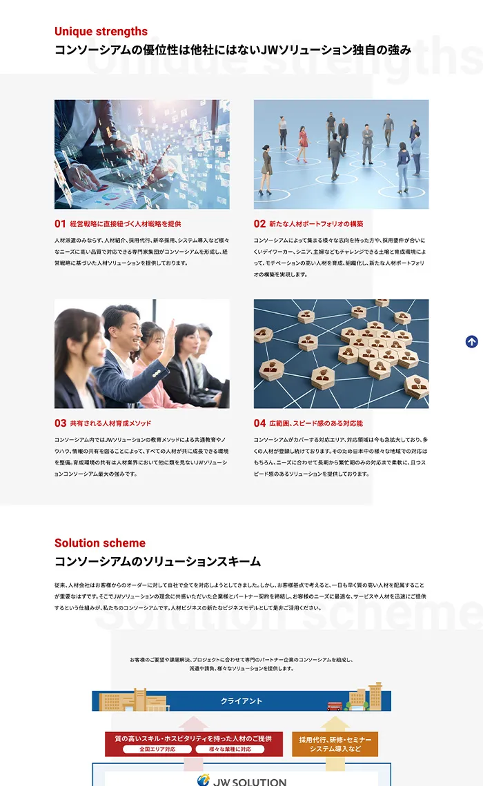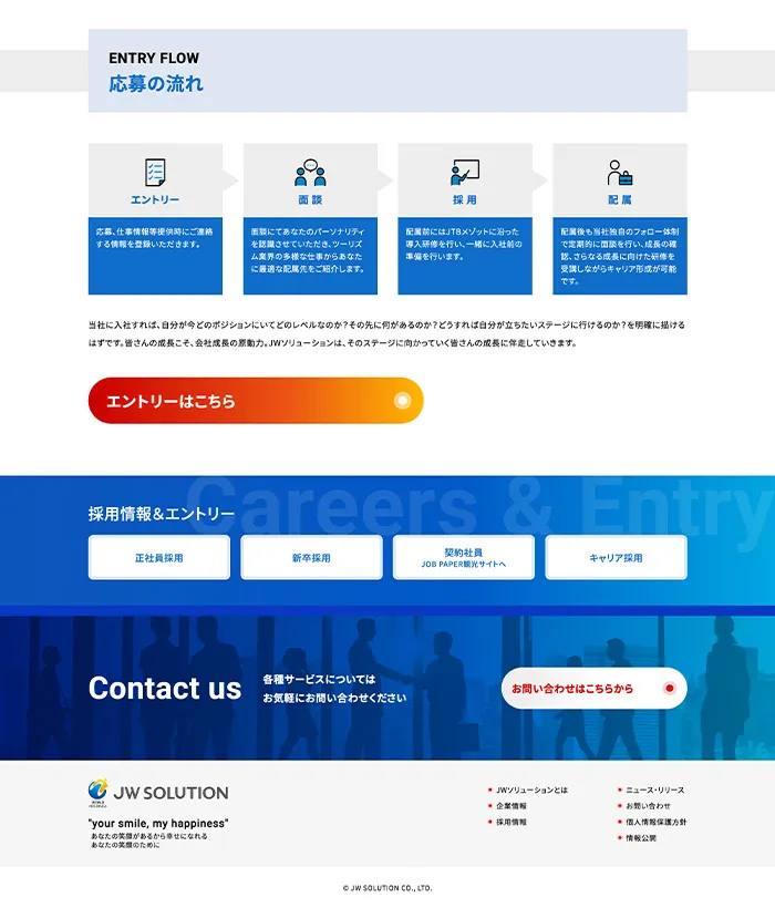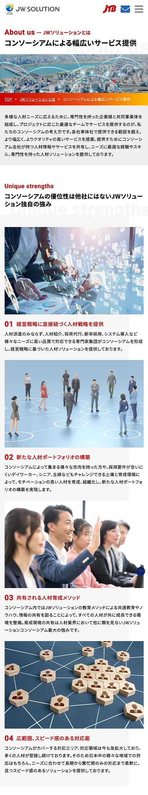 ツーリズム業界最大手のJTBと人材業界大手のワールドが出資した観光業界専門の人材企業JWソリューションのコーポレートサイト。会社設立に合わせた新規制作だったこともあり企業ブランドやコンセプトメイキングからコミットして制作。構成企画からライティング、デザイン、コーディング、実装まで全て担当。